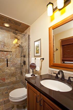 - The master bath makeover was completed with a new custom shower area and extensive tile with a natural look.