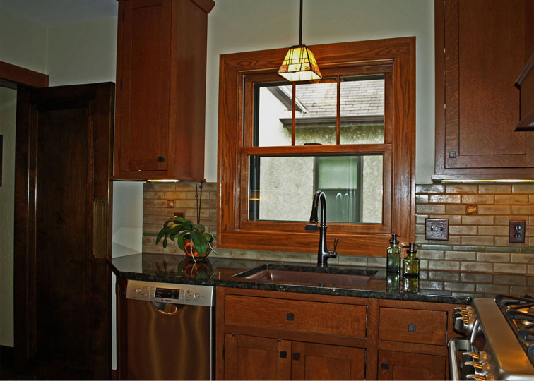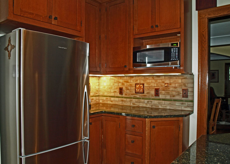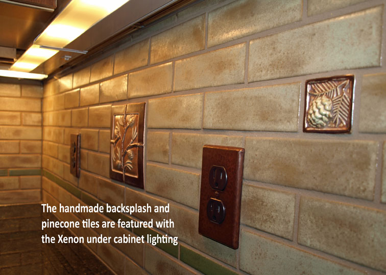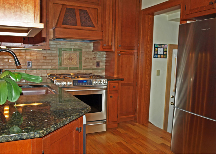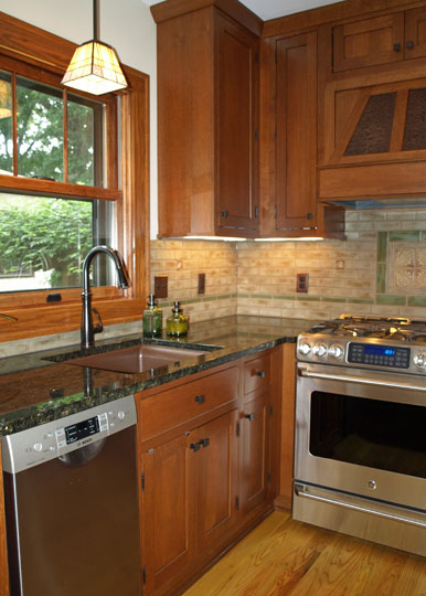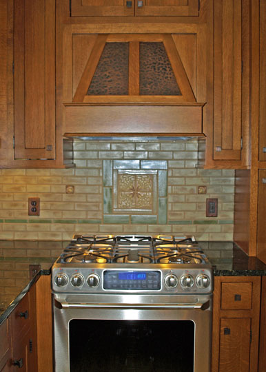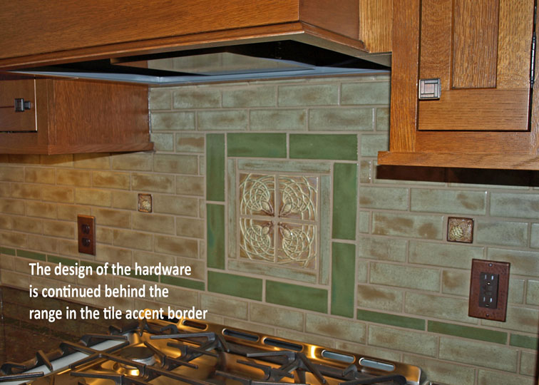 - handmade Arts and Crafts accent tiles—strategically placed to allow ample room for kitchen gadgets without blocking the beautiful tiles