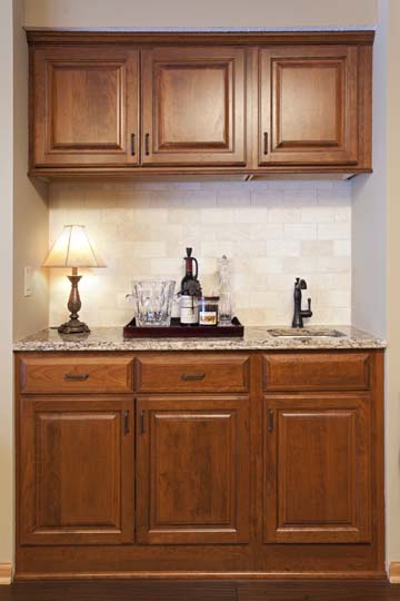 The cabinetry used in the remodel is by Showplace Wood — Covington door style in Cherry wood, with an Autumn stain and Ebony glaze. The countertops are by Cambria in the color Laneshaw in the kitchen area, accented with Cambria countertops in Bradshaw on the bar and in the bath.