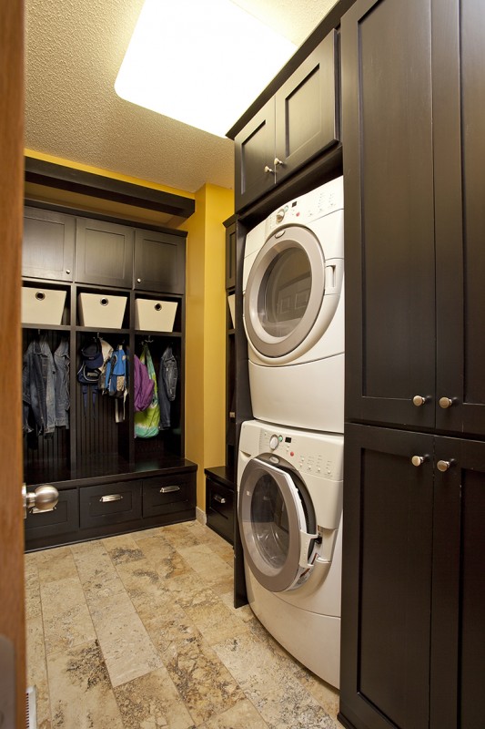 MUDROOM — Seeking a different storage layout, a closet in the mudroom was removed and the washer and dryer stacked to make room for cabinetry-style lockers, a system of drawers, and a big closet cabinet. Perfect for hanging clothing and storing extra laundry baskets!
