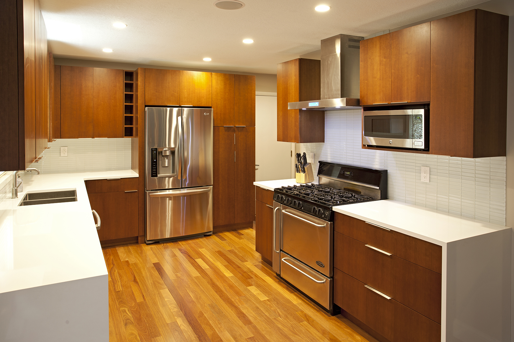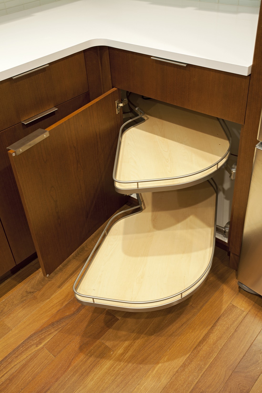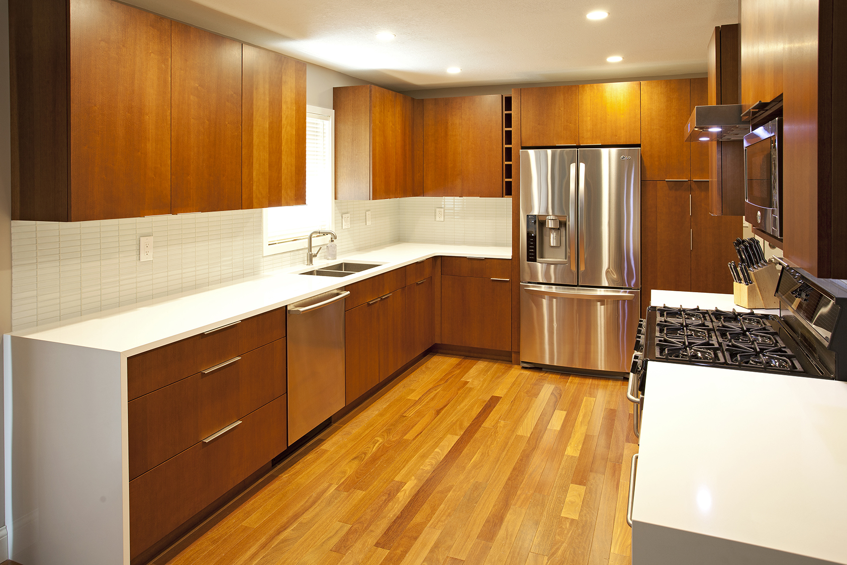 With the challenge of staying within the footprint of their new wood floor, we designed a new cabinetry layout that gave them the additional cabinet drawers and functional storage they were hoping for.