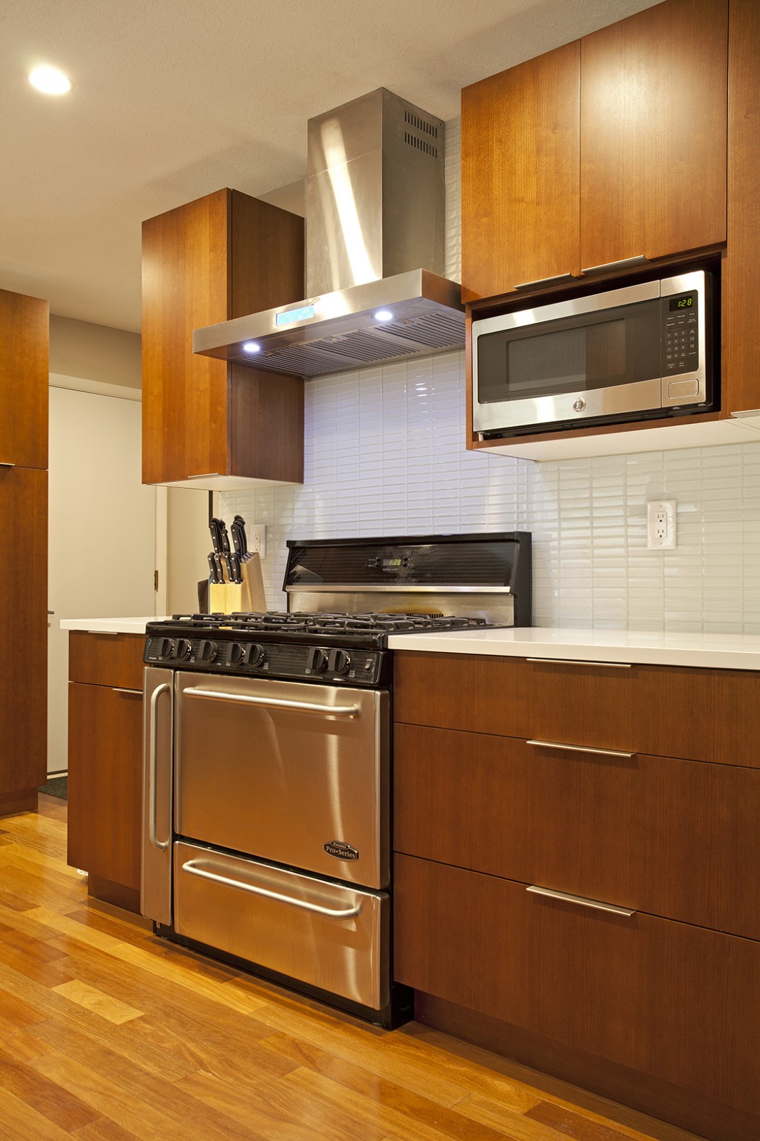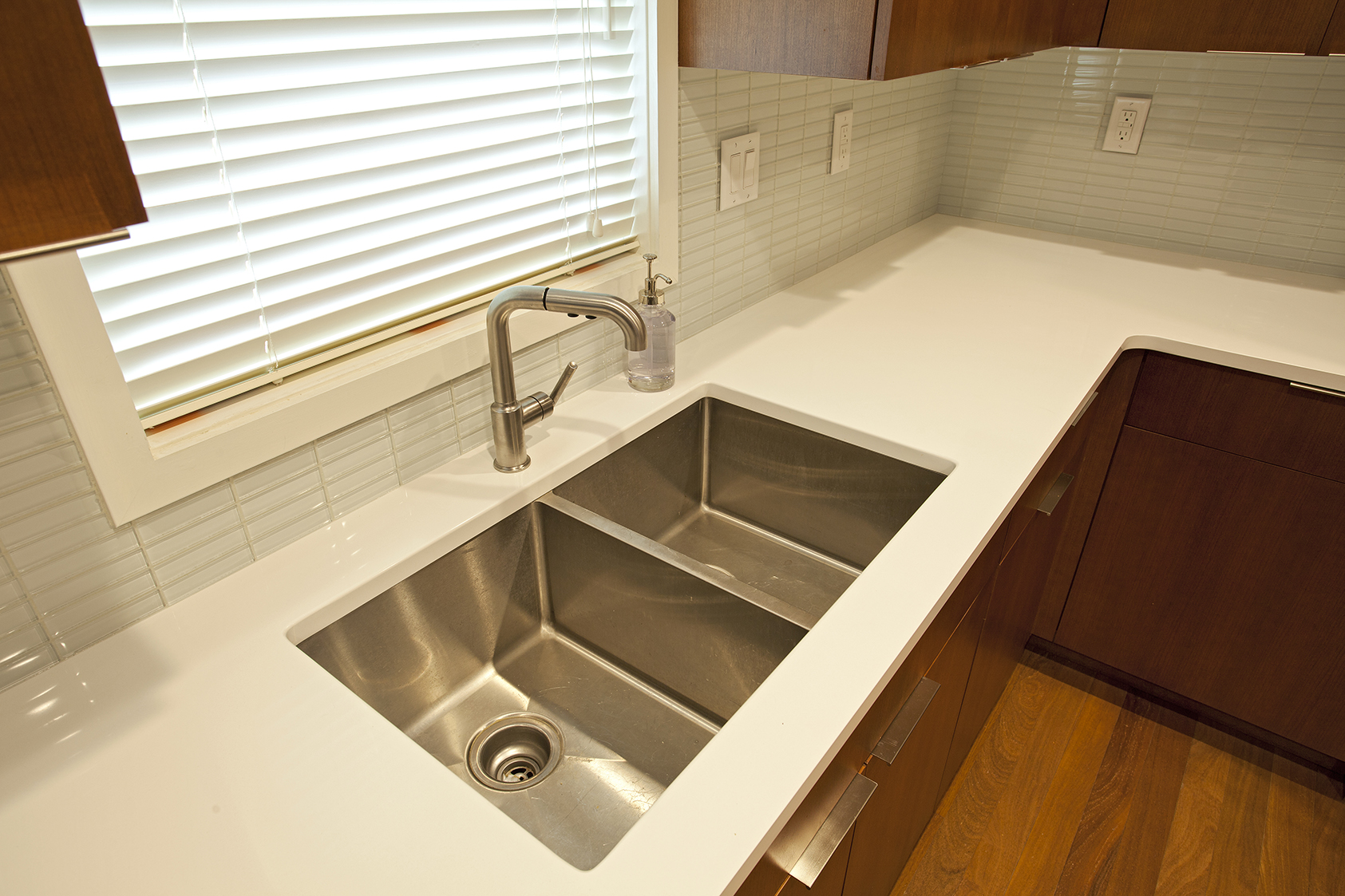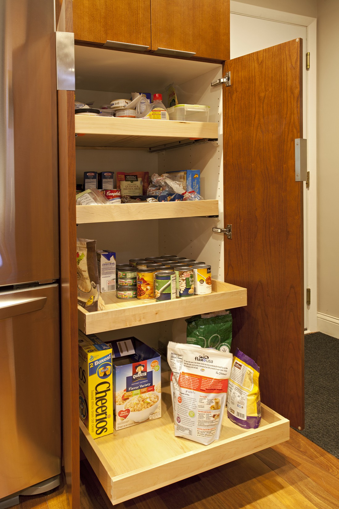 With the challenge of staying within the footprint of their new wood floor, we designed a new cabinetry layout that gave them the additional cabinet drawers and functional storage they were hoping for.