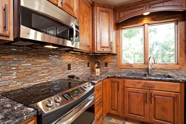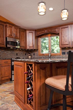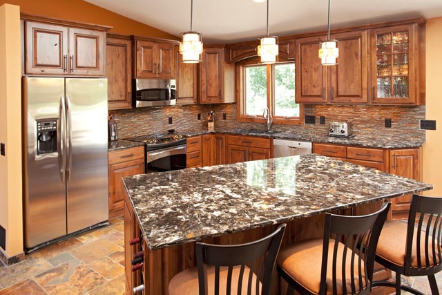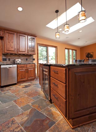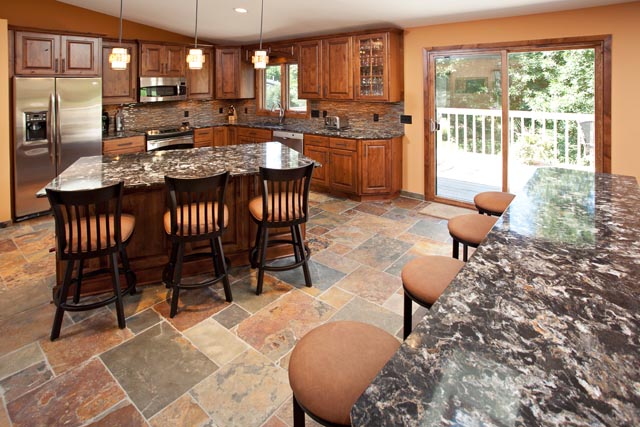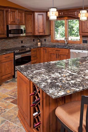 With that in mind, they wanted to open up their space, remove the wall dividing their kitchen and living room, and pump up their entertaining area with the installation of a new bar. In working on this project we had the opportunity to utilize a variety of great elements. For example, for their cabinets the homeowners chose the rustic Covington door style, stained in a rustic alder autumn finish. For their floors, the family went with a unique slate option. To help illuminate their choice, we installed under cabinet lighting at floor level. Lastly, they topped their room with one of the latest and greatest Cambria countertop color options – Hollinsbrook. Newly introduced in May of 2012, this great color and pattern palette helped to pull the room together and add personality!