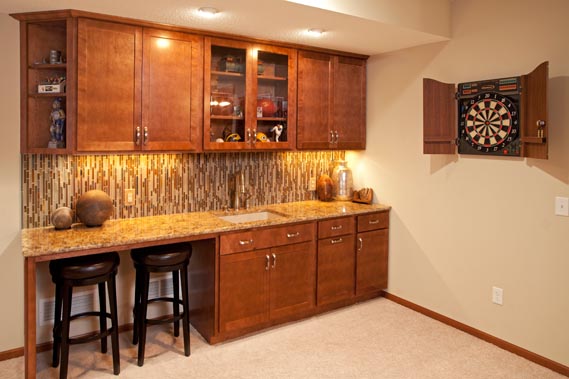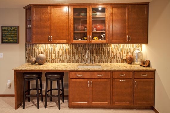 - We designed two bar areas for them, using cabinetry from our Countryside Cabinetry line – affordable and attractive.