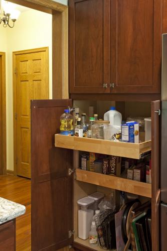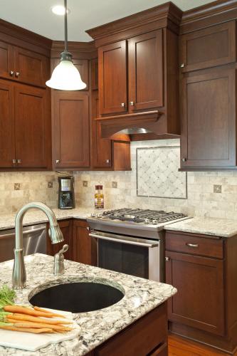 This kitchen of this traditional two story in Apple Valley was transformed from outdated to updated, with better flow and more storage, all within the same footprint. After Ohana Construction gutted the kitchen, took out the soffits, and put in a new floor, The Cabinet Store + Culina Design stepped in to install brand new Showplace Wood Cherry Cabinets to the ceiling, and moved the range and fridge for better traffic flow. We also added a wood vent hood over the new stove, and included a few glass doors on the cabinets for interest. The new countertops in Cambria’s Bellingham tone, compliment the look nicely.