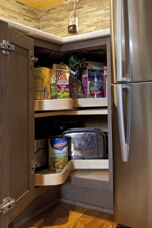 The homeowners chose the Showplace Wood Chesapeake door style in Red Oak wood with a matte Driftwood finish to accent the beautifully-aged original woodwork throughout the home. The gray of the Driftwood over the natural wood of the Red Oak creates a lovely unique style and color tone. The contemporary organizational and storage cabinet pieces from Showplace are also a much appreciated addition to this vintage kitchen.